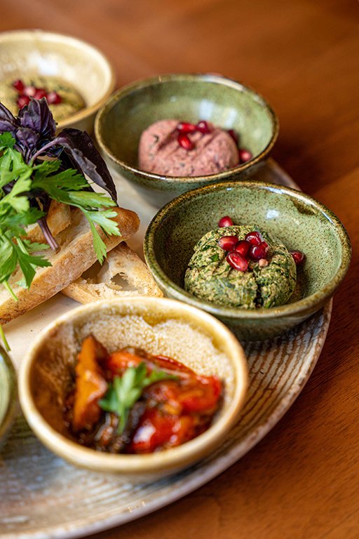 Başlangıçlar: Renkli Pkhali çeşitleri, çıtır patlıcan salatası, nar salatası
