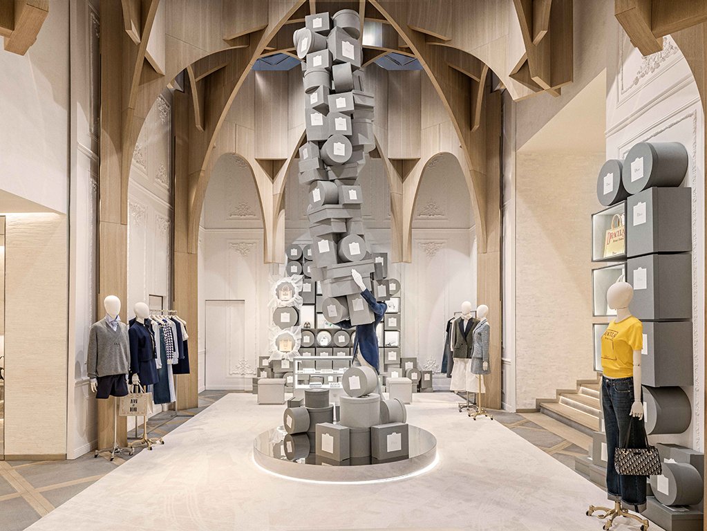 Arşivlere neşeli bir saygı duruşu niteliğindeki bu sürükleyici sahnelemeler, Dior’un ilk butiğinde kullanılan ve ‘Colifichets’ adıyla bilinen kutuları eğlenceli bir biçimde yeniden yorumluyor. 30 Montaigne’in imza grisine gönderme yapan bu kutular, vitrinlere taşıp mekânı dolduruyor ya da üst üste, biraz eğri büğrü kuleler halinde yığılıyor; ip cambazı rolüne bürünen yaramaz ‘bellboy’lar tarafından taşınıyor.