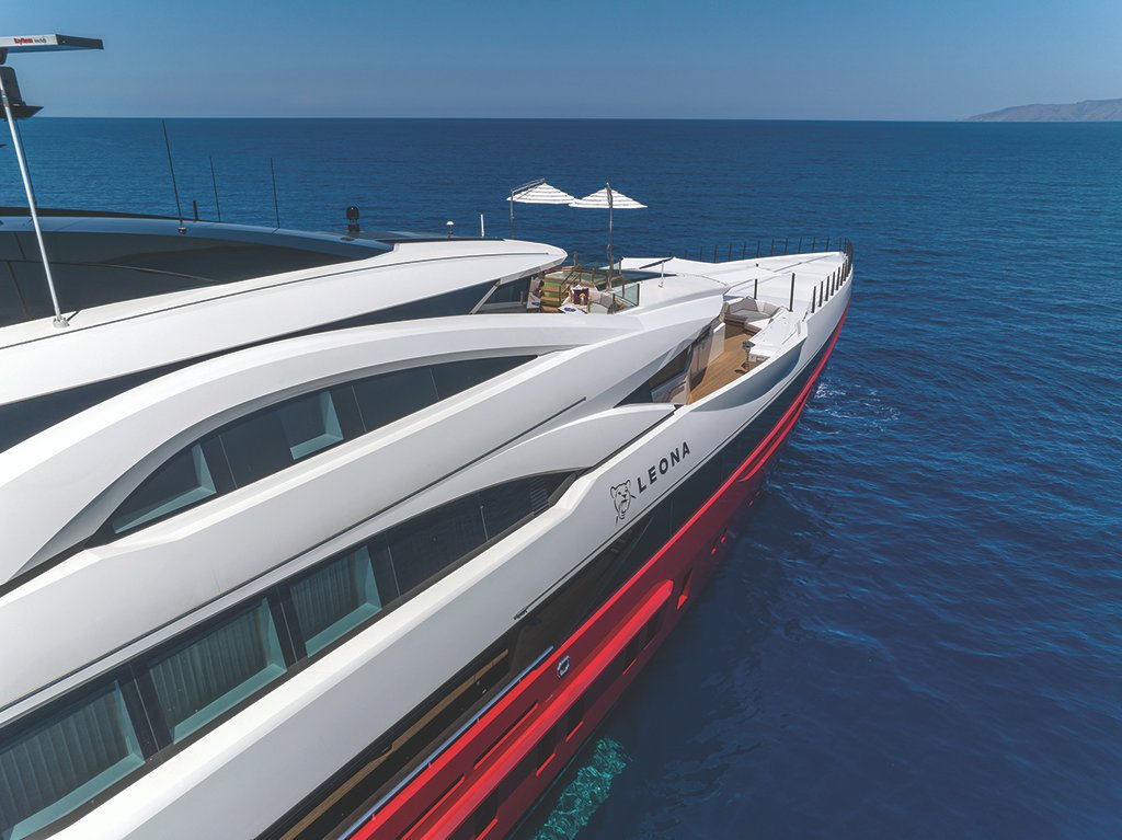 Mühendisliği ve dış tasarımı Antalya merkezli Unique Yacht Design’a ait Leona, geçtiğimiz yıl süperyat dünyasının prestijli ödüllerinden BOAT International Design & Innovation Awards’ta “60 metre ve Üzeri Motor Yatlar, Olağanüstü Dış Tasarım” kategorisinde birinciliğe layık görüldü. Silüetini zarifçe uzayan mermi formundaki baş yapısıyla kazanan ve sportif görünüme kavuşan Leona’nın ön güvertesi, devasa bot ve oyuncak garajını ustalıkla gizleyen bembeyaz, yalın bir düzlem olarak tasarlandı. Enerji tasarrufu, hız artışı ve konfor sağlamak amacıyla su hattı altına yerleştirilen bulbous pruva ise yatın teknik üstünlüklerinden biri.