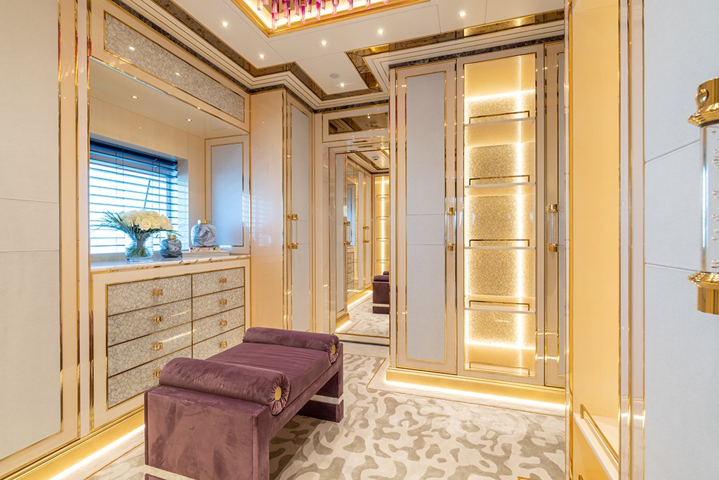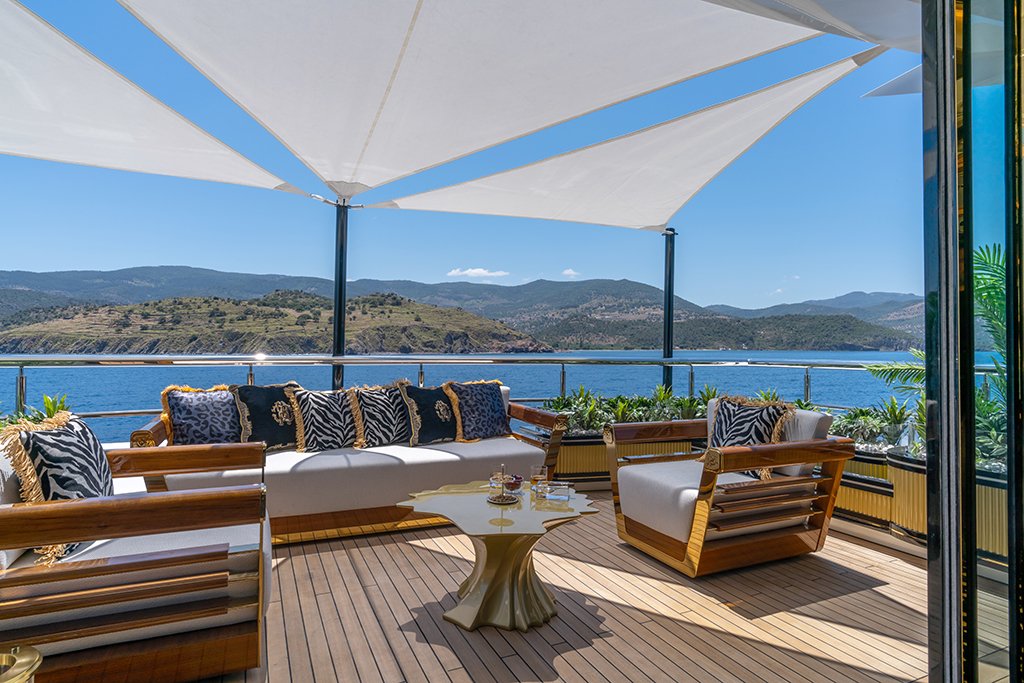 Leona’nın iç mekanları, tekne sahibinin yüksek lüks beklentileri doğrultusunda titizlikle düzenlendi. Detaylı işçilik, altın kakmalar ve zengin dokulu tekstil malzemeleri ustalıkla harmanlandı. Bilgin’in özenle inşa ettiği Leona, Roberto Cavalli ve Boca do Lobo gibi seçkin markalardan temin edilen mobilyalarla benzersiz atmosferine kavuştu.