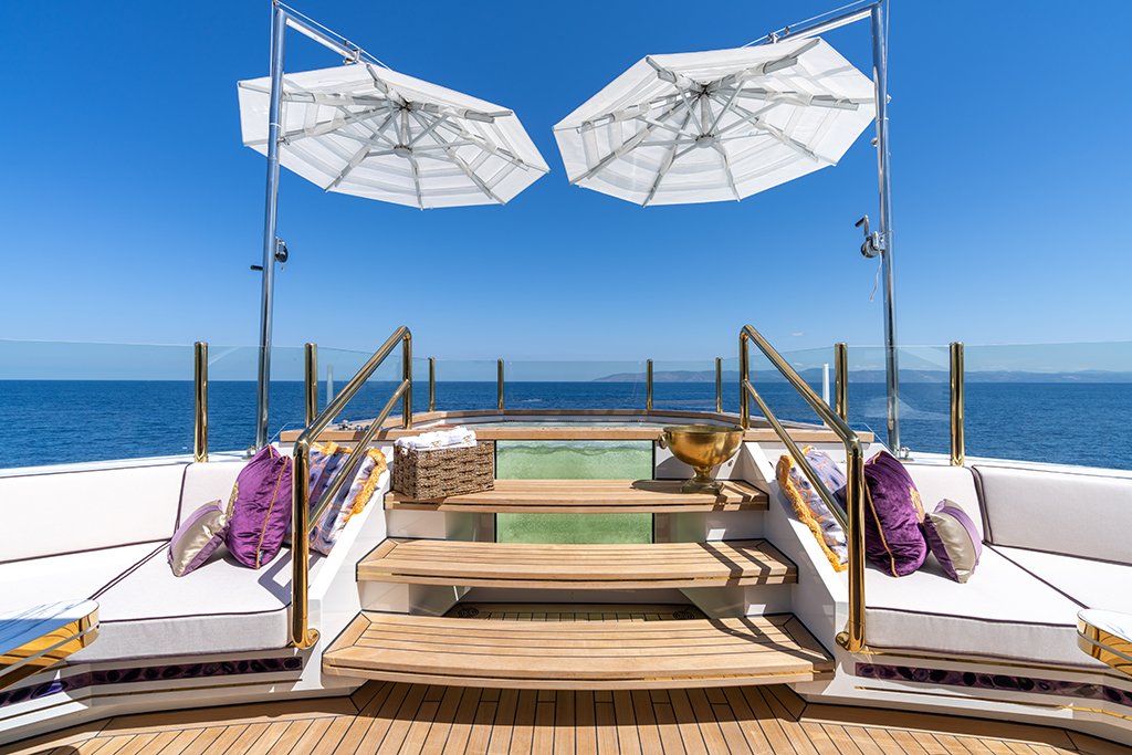 Leona’ya karakterini veren en önemli özelliklerinden biri alt güvertedeki beach club’ı. Havuz kenarına yerleştirilen Antik Yunan heykelleri, mavi desenli fayanslarla kaplı 8,7 metreye 3 metrelik havuza sular püskürtüyor. Gece göğünü andıran yıldız desenli fiber optik aydınlatma, bir Barrisol germe tavanla bütünleşiyor. Alanda ametist taşlar ve agat detaylarla süslenmiş bir bar uzanıyor. Zeminde elmas desenli döşeme göze çarpıyor. İskelede Fas esintili nargile odası, açılır deniz terası kapısıyla suyla doğrudan bağ kuruyor. Burası iç mekandan sürgülü cam kapılarla ayrılabiliyor.